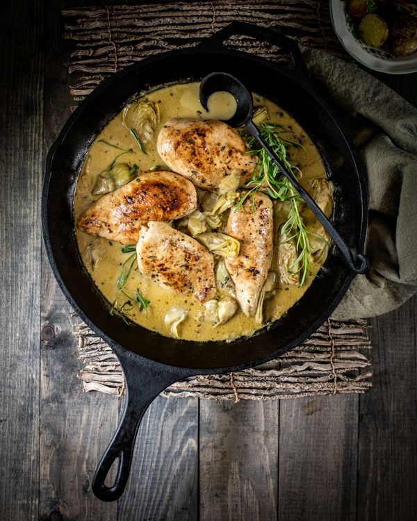 - Add the chicken fillets back into the skillet and spoon the sauce on top. Arrange the artichokes hearts all around the chicken.